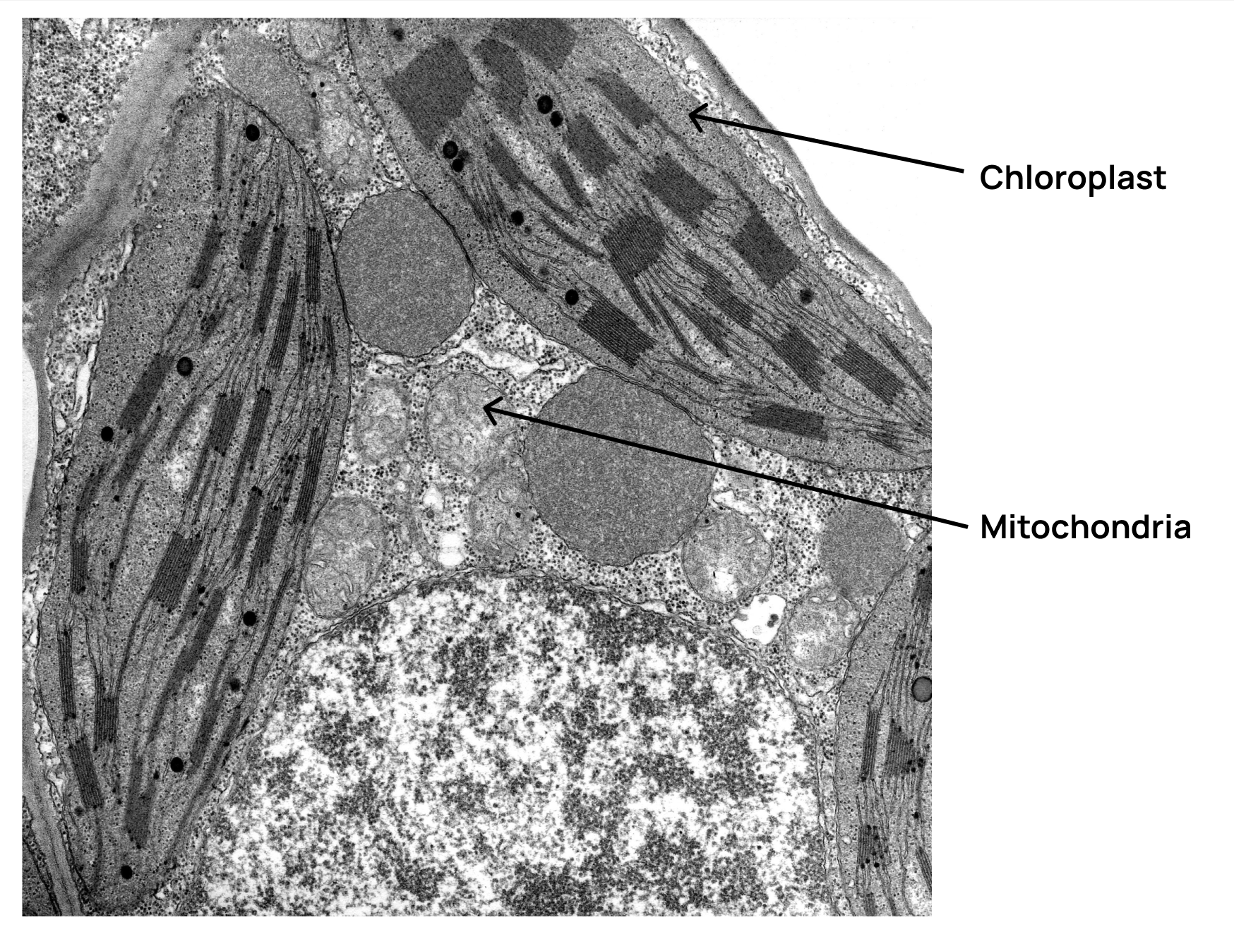The image shows part of a plant cell with a chloroplast in close proximity to mitochondria.