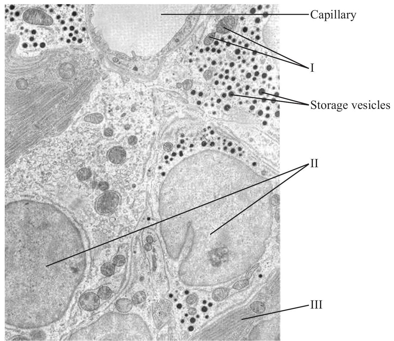 Identify the structures labelled I, II and III in the micrograph above and give a role for each one.