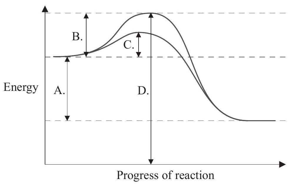 The following graph shows energy changes with and without enzymes during a chemical reaction. Which letter represents the activation energy required to carry out this reaction without an enzyme catalyst?