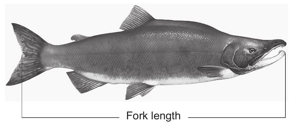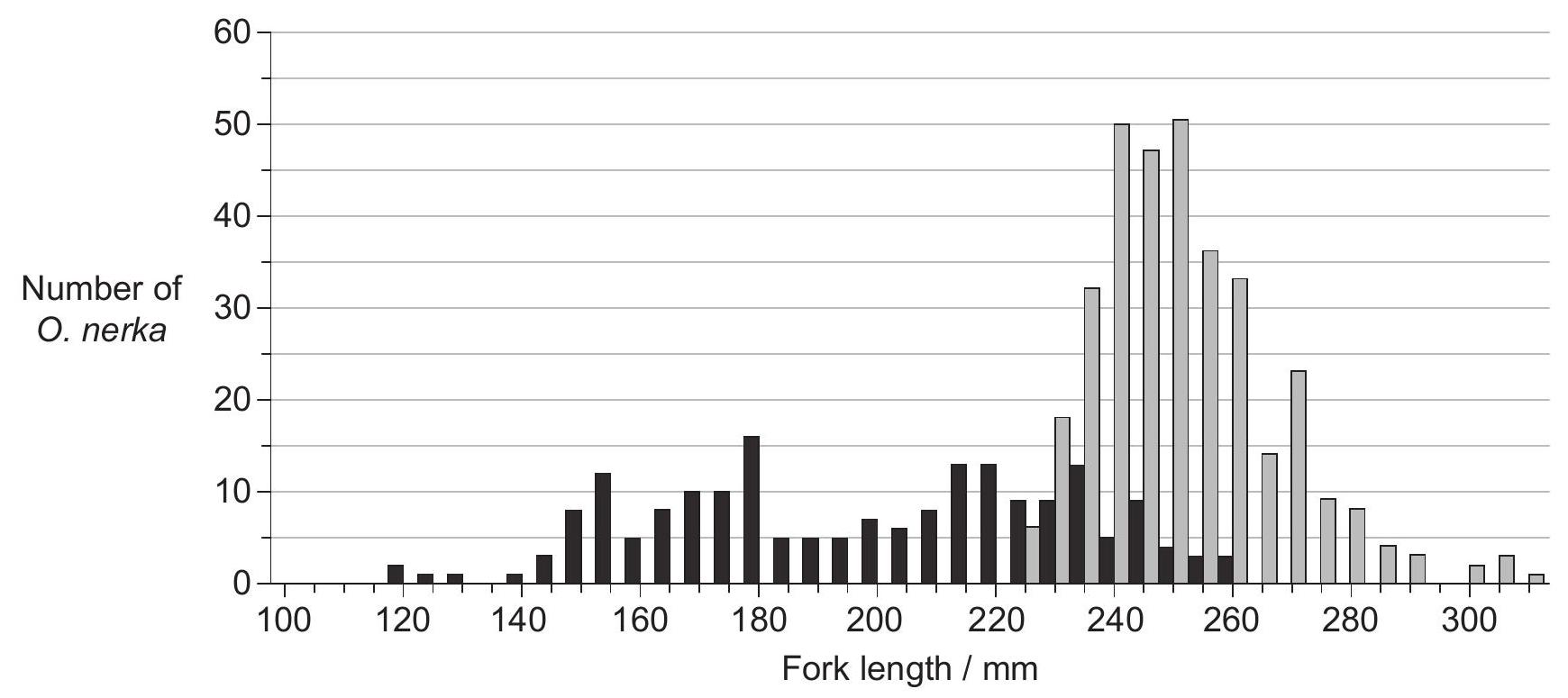[Source: "Oncorhynchus nerka" by Timothy Knepp of the Fish and Wildlife Service. US Fish and Wildlife Service. Licensed under Public Domain via Commons https://wccyusoueahdpdicsyrg.supabase.co/storage/v1/object/public/question-images/images/b9c32b2e-53b8-4722-a4a4-2c906ad6d8f4.jpg] The graph shows fork length frequency of juvenile O. nerka caught during their first months in marine waters in autumn 2008 and ocean age one O. nerka caught 15 months later during winter 2009 in the North Pacific Ocean.