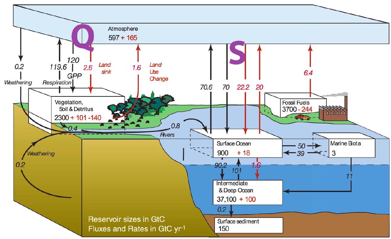 The diagram shows the carbon flux in gigatonnes per year between some of the Earth's global reservoirs.