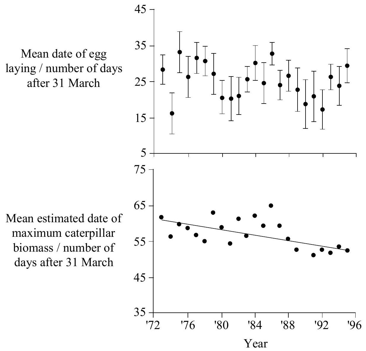 [Source: Walther et al., Nature (2002), 416, pages 389-395] From 1973 onwards phenologists in the Netherlands have been studying a population of great tits (Parus major) in a forest on the Hoge Veluwe. Nest boxes are checked every week to find out when the great tits lay their eggs and how many eggs they lay. Young birds are ringed when they are seven days old, to allow the reproductive success of their parents to be monitored. Great tits feed on arthropods, especially caterpillars. The phenologists found that the date of maximum caterpillar biomass each year in the forest could be estimated accurately using temperature records. The graphs below show the mean date of egg laying and the estimated date of maximum caterpillar biomass for each year from 1973 to 1995.