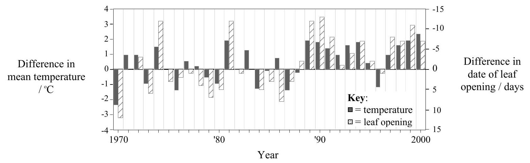 Phenologists are biologists who study the timing of seasonal activities in animals and plants, such as the opening of tree leaves and the laying of eggs by birds. Data such as these can provide evidence of climate changes, including global warming. The date in the spring when new leaves open on horse chestnut trees (Aesculus hippocastaneum) has been recorded in Germany every year since 1951. The graph below shows the difference between each year's date of leaf opening and the mean date of leaf opening between 1970 and 2000. Negative values indicate that the date of leaf opening was earlier than the mean. The graph also shows the difference between each year's mean temperature during March and April and the overall mean temperature for these two months. The data for temperature was obtained from the records of thirty-five German climate stations.