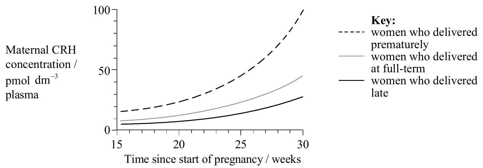 Near the middle of pregnancy in humans, the placenta begins to secrete a hormone called corticotrophin-releasing hormone (CRH). CRH influences the production of hormones which stimulate the development of the fetus. A study was carried out to determine if levels of CRH were correlated with the timing of the baby's delivery. Blood samples were taken from 500 women during their pregnancies and the concentration of CRH was measured. The women were then divided into three groups according to whether their baby was delivered prematurely, at full-term (about 40 weeks) or late. The graph below shows how the concentration of CRH varied in the mothers' blood (maternal blood) in each of the three groups during pregnancy.