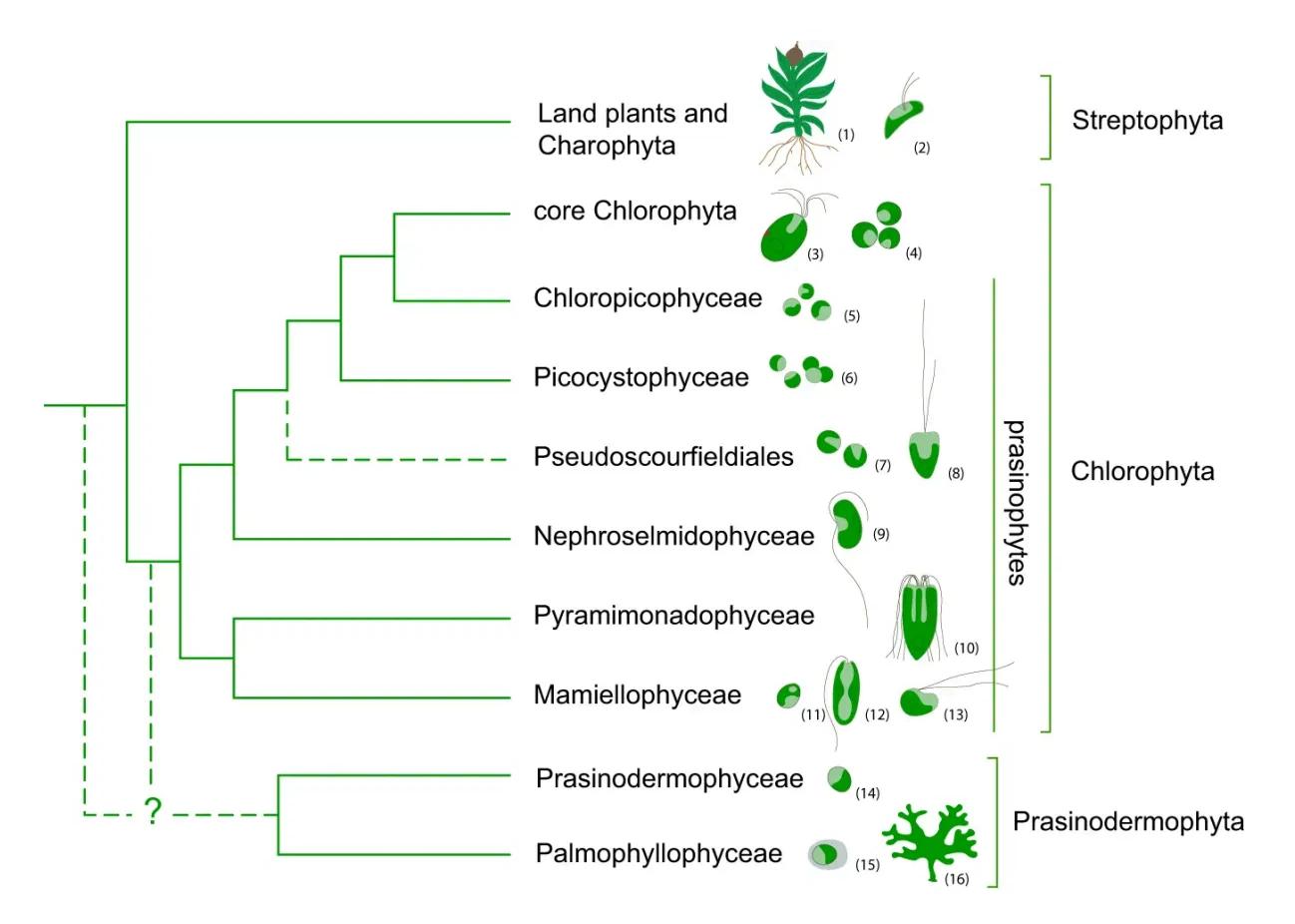 The figure shows a phylogenetic tree of land plants, Charophyta, and various green algae clades (Chlorophyta, Prasinodermophyta).