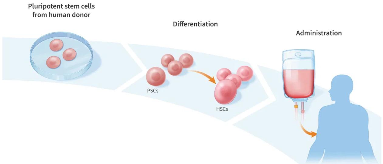 The image shows pluripotent stem cells (PSCs) from a human donor being differentiated into hematopoietic stem cells (HSCs) before being administered to a patient.