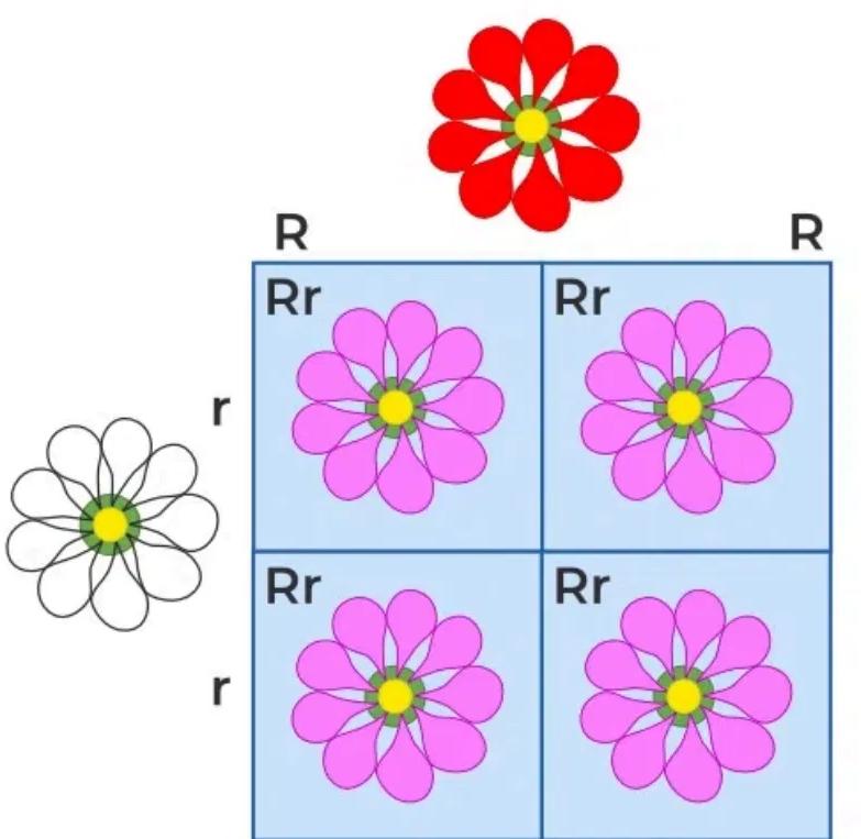 The Punnett square shown represents a cross between a red-flowered plant (RR) and a white-flowered plant (rr), producing all heterozygous offspring (Rr) with pink flowers.