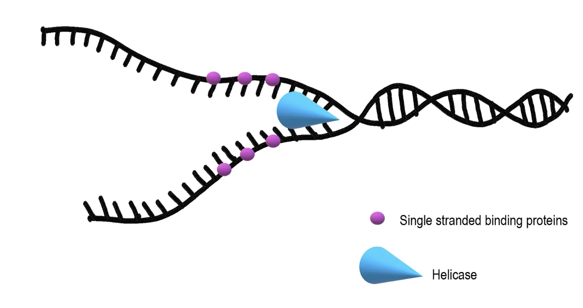 | Helicase | Unwinds the DNA double helix | Breaks hydrogen bonds between base pairs |