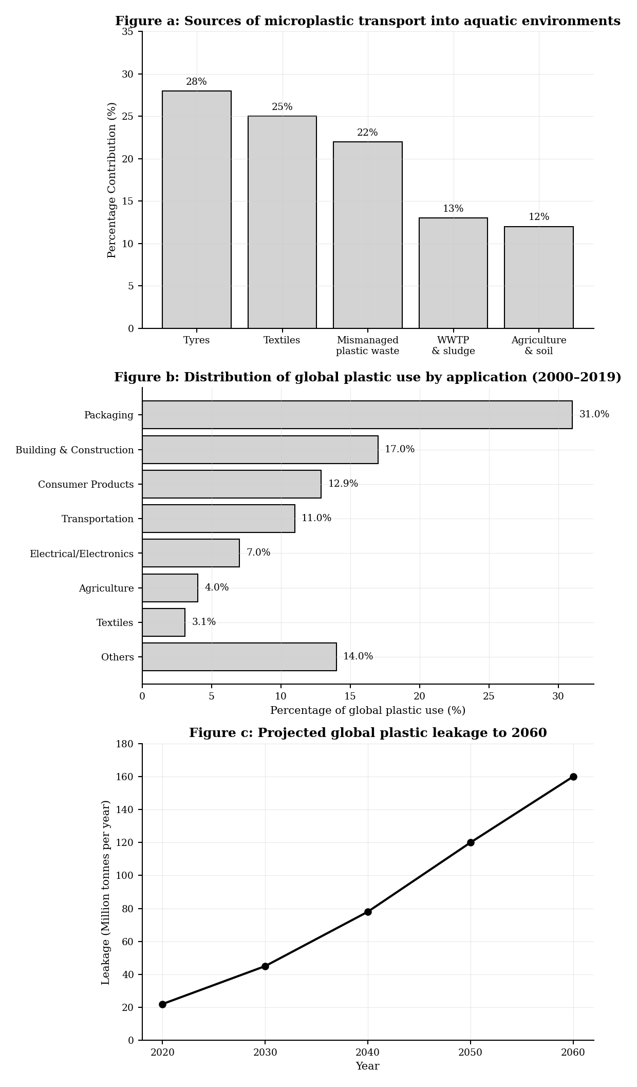 Use Figure b to identify one sector of plastic use most likely to contribute to: