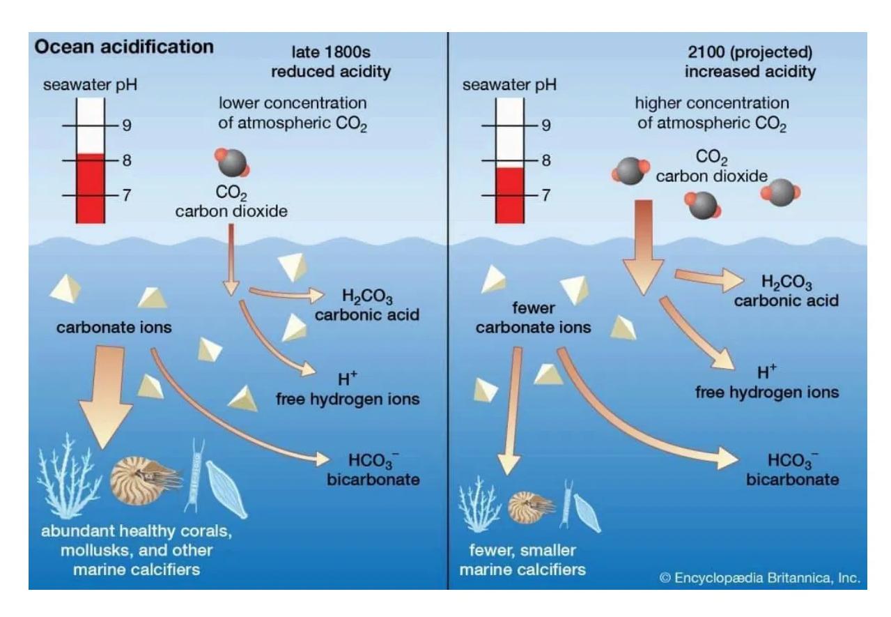 The figure shows the effect of increasing atmospheric CO2 on ocean pH and the availability of carbonate ions, which are essential for the formation of calcium carbonate shells and skeletons in marine organisms such as corals and mollusks.