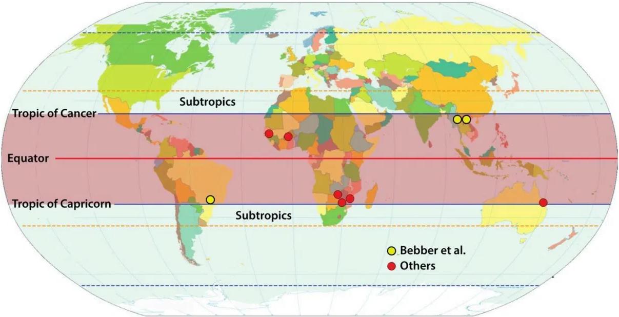 Using Figure a, identify one tropical region where studies have been conducted.