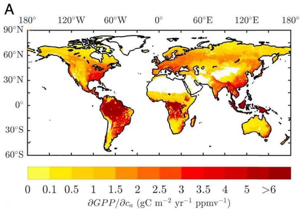 Image A maps the rate of GPP (gross primary production) change with rising .