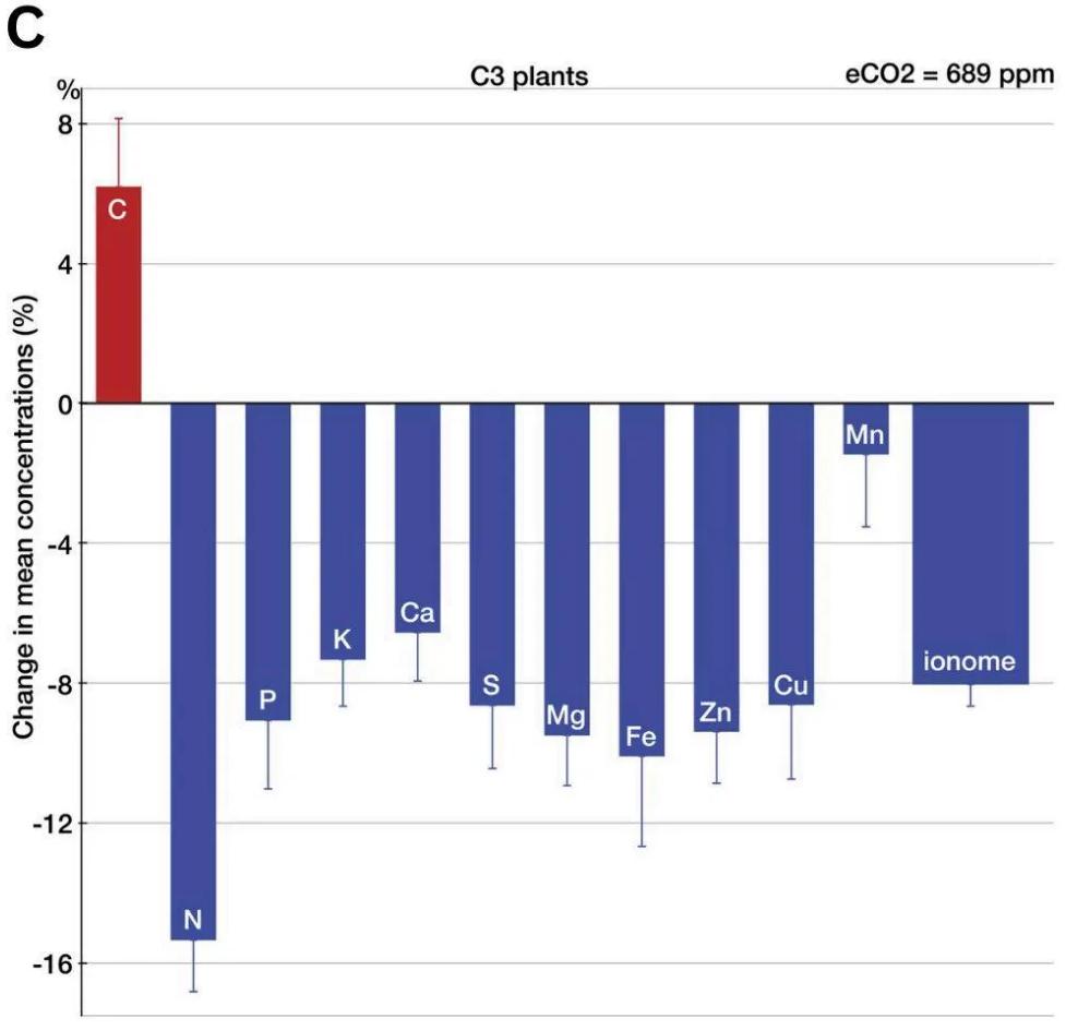 Image C shows changes in essential nutrient concentrations in crops grown at elevated CO2 (689 ppm).