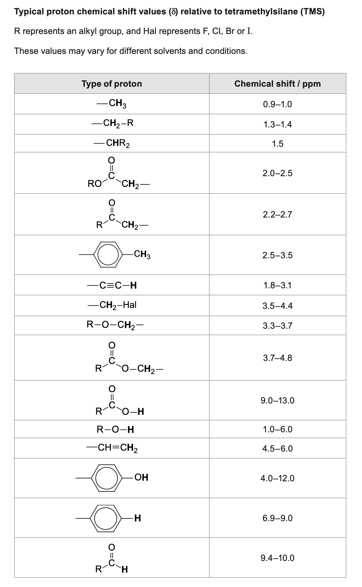 Typical proton chemical shift values ( ) relative to tetramethylsilane (TMS) R represents an alkyl group, and Hal represents or I . These values may vary for different solvents and conditions.