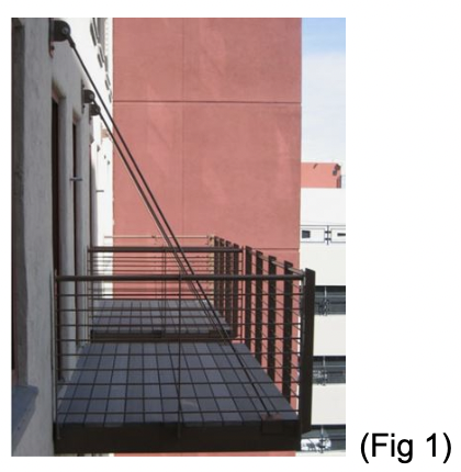 Figure 1 shows a cantilevered steel balcony protruding from a modern building façade.