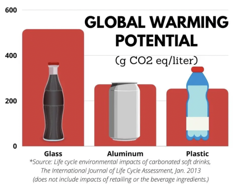 Figure 3 shows a bar chart comparing CO2 for plastic, glass, and aluminum packaging from raw material extraction to disposal.