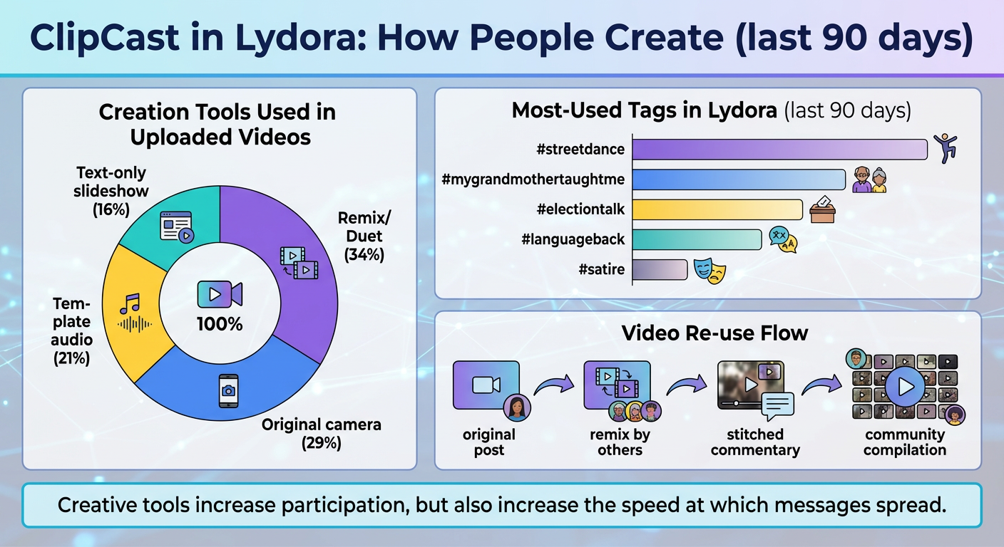Of all removals in Lydora (last 90 days): 41% harassment, 24% hate speech, 18% impersonation, 10% copyright-related, 7% other. Average views by content type: satire posts receive 2.3× the views of "personal storytelling" posts. In posts using the tag #languageback, 58% are remixes/duets (often adding pronunciation tips). 12% of users who posted political content received at least one "mass report" (50+ reports within 1 hour). Appeals success rate: 31% of appealed removals are reinstated.
