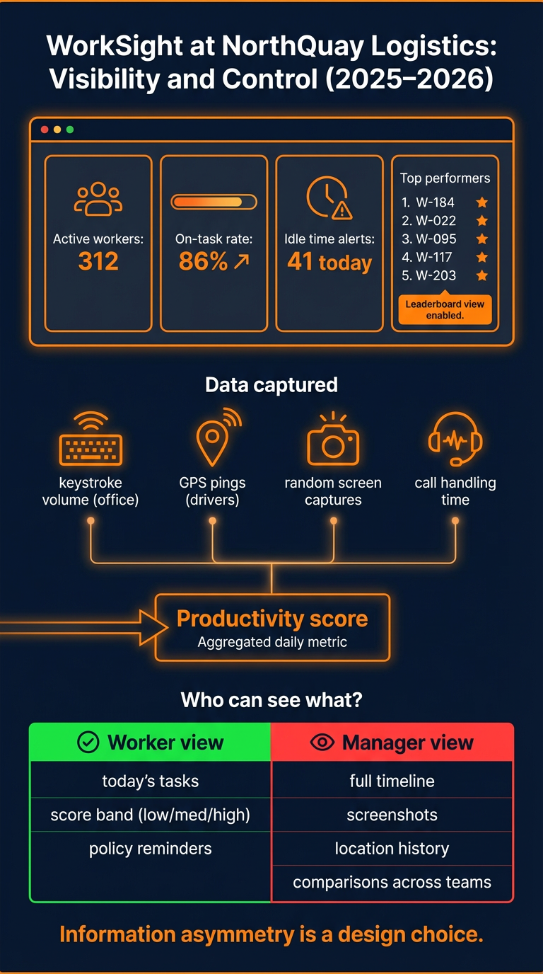 NorthQuay Logistics deployed WorkSight to standardize performance management across its warehouses and delivery fleet. In a staff email, leadership said WorkSight would “increase fairness by using consistent metrics” and “help identify training needs early.” The email also stated that monitoring would “reduce safety incidents by flagging fatigue and distraction” and “protect customers through stronger accountability.” Managers were encouraged to use the dashboard for coaching conversations and to document repeated low scores. Workers were told they could view their status in the WorkSight app, but that some data (such as comparison rankings and screenshot logs) would remain manager-only “to prevent gaming the system.” The company said data would not be sold, but it could be shared with contracted HR services for auditing and dispute resolution.