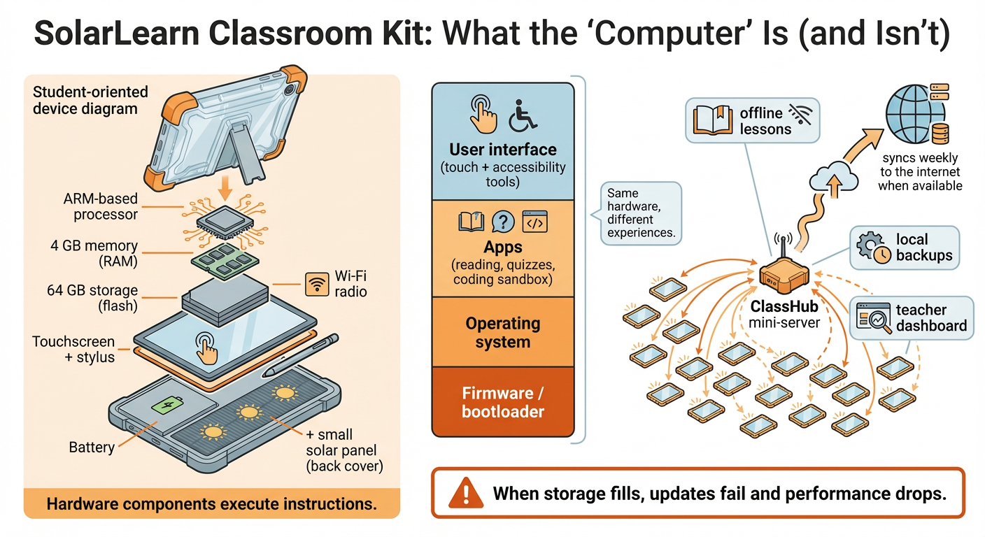 SolarLearn is often described as “giving every child a computer,” but the question is what kind of computing is being provided. Locked-down tablets can become consumption-first devices: excellent for viewing lessons, weaker for open-ended creation, repair, and experimentation. When schools cannot install tools freely, “learning computing” may shrink into “using apps.” The ministry highlights progress tracking, yet that framing treats education as measurable outputs rather than messy human development. There is also a hidden hardware politics: batteries, screens, and storage limits become educational constraints, and remote schools pay the price when repairs are slow. A computer is not only a box of components; it is a socio-technical arrangement of devices, software permissions, training, and support. If the kit expands access, it must also avoid turning students into passive users of a predefined interface.
