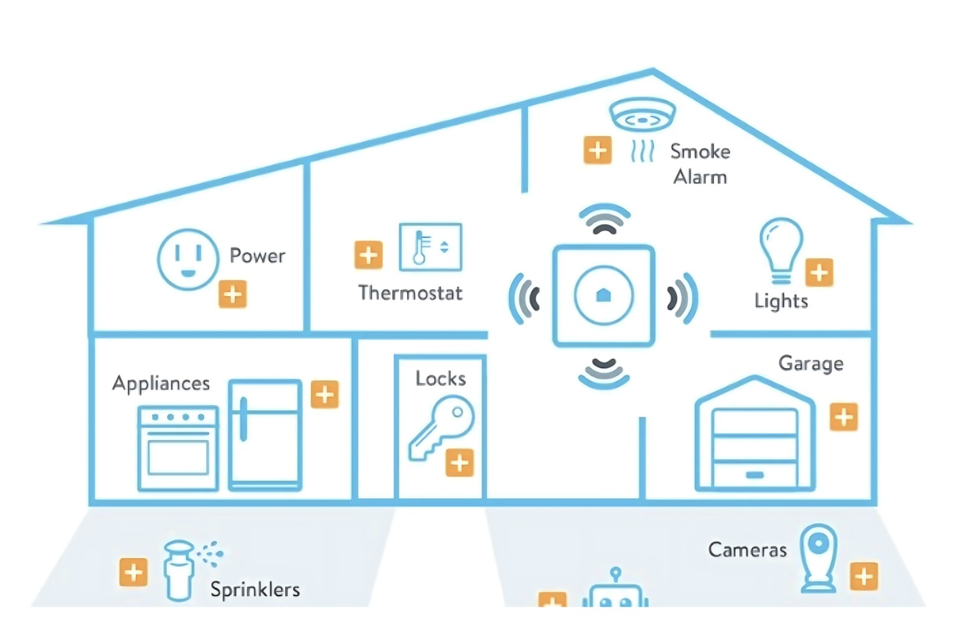 Source C A smart home is a household with internet-connected appliances you can remotely control using a tablet or smartphone. It uses smart devices such as smart TVs, smart thermostats, air conditioners, and even a robot vacuum. They are then connected together in a single network, through either hardwired or wireless systems like Zigbee, Wi-Fi, Bluetooth, and NFC, among others. Using the Internet of Things (IoT) technology, your smart appliances can communicate and share real time data with each other. This allows the devices to perform scheduled and automated tasks. IoT home gadgets bounce data back and forth with the use of sensors, learning and processing your patterns to automatically adjust themselves to your comfort. Some smart home Internet of Things applications are automatic light switches, burglar alarms, and voice-activated sound systems.