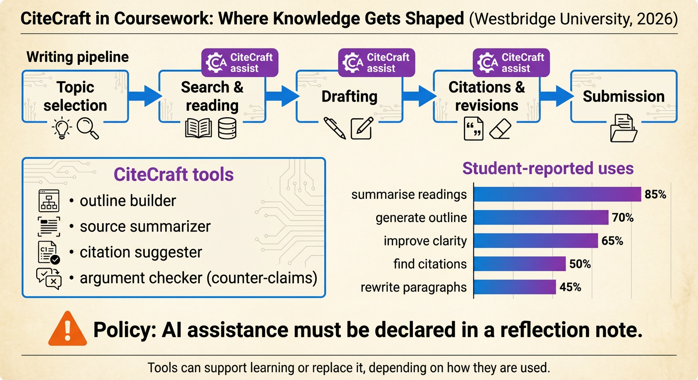 Source B (local newspaper excerpt) Westbridge University integrated CiteCraft, a generative writing assistant, into its learning platform. Students can paste notes, request outlines, and receive suggested citations linked to the university library catalogue. The university policy allows CiteCraft for planning, clarity and citation formatting, but forbids submitting AI-generated text as one’s own work without attribution. For assessed essays, students must include a short reflection describing how (if at all) they used the tool. Westbridge argues that banning such tools is unrealistic and that guided use can strengthen academic skills. Some faculty members say CiteCraft helps students who struggle with language and structure, while others worry it reduces independent reading and encourages “surface-level” engagement with sources. The university stores prompts and outputs for quality monitoring and claims they are not used for marketing.