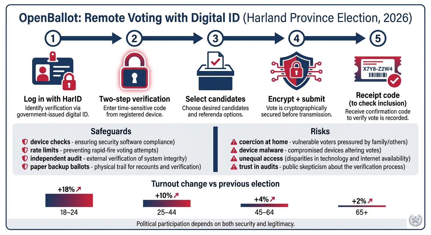 Harland Province piloted OpenBallot, an online voting system for provincial elections. Eligible voters could vote remotely using HarID, a government digital identity, with two-step verification. The electoral commission said OpenBallot aimed to improve participation for students, shift workers and residents abroad. Voters received a receipt code that allowed them to confirm that their encrypted ballot was included in the final count, without revealing their vote choice. The commission emphasised that in-person voting remained available and that paper ballots were used for recount capability. Civil society observers were invited to review the system design and the post-election audit summary. However, some parties argued that remote voting increases the risk of coercion in households and that security explanations are too technical for ordinary citizens to judge.