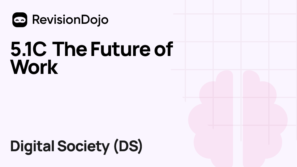 These comprehensive video lessons help IB Digital Society (DS) students Standard Level (SL) and Higher Level (HL) understand and master the essential concepts needed for success in IB Exams. Each video focuses on 5.1C The Future of Work and is aligned with the IB Digital Society (DS) syllabus, ensuring focused learning on systems and structures, human behavior and interaction, and digital technologies in society. Students can watch and rewatch anytime, anywhere, perfect for visual learners, reinforcing complex concepts, and understanding IB methodology. By using RevisionDojo's video lessons consistently, learners build deep understanding and enter the exam with confidence.