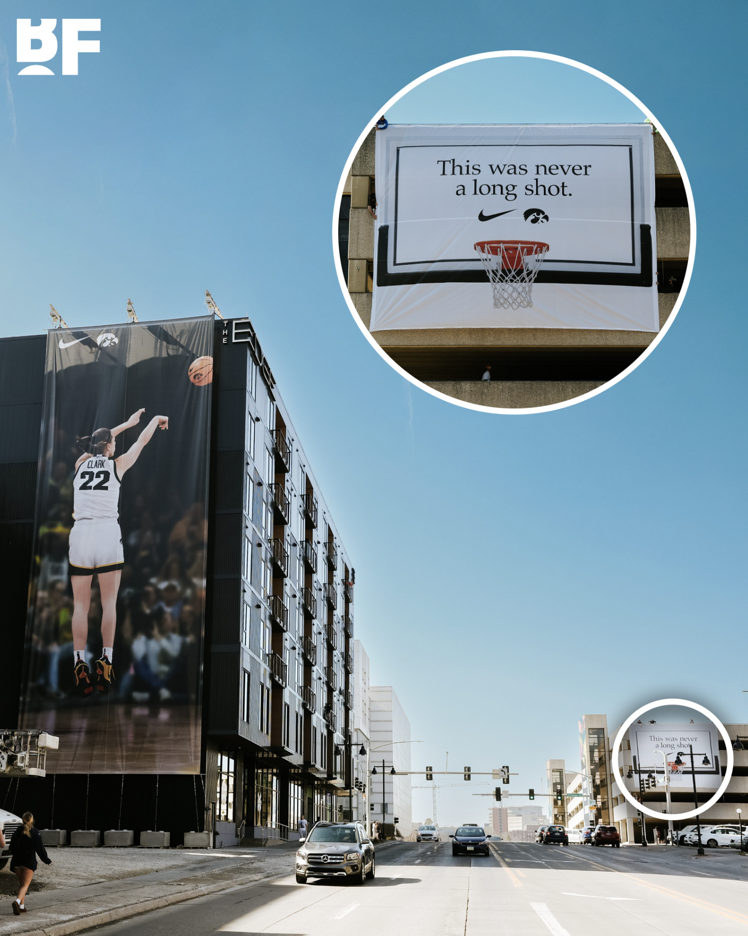 This text features a large banner of basketball player Caitlin Clark (#22) taking a shot, placed on the side of a building. Caitlin Clark was the #1 pick in the WNBA Class of 2024, and winner of the season’s Rookie of the Year award. She is known for her distance three-pointers. Analyze how visual elements is used to convey the purpose of this text.