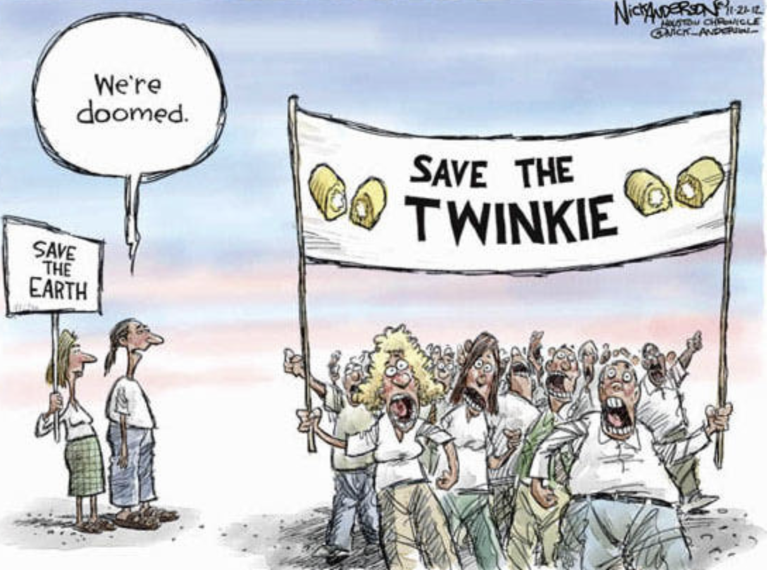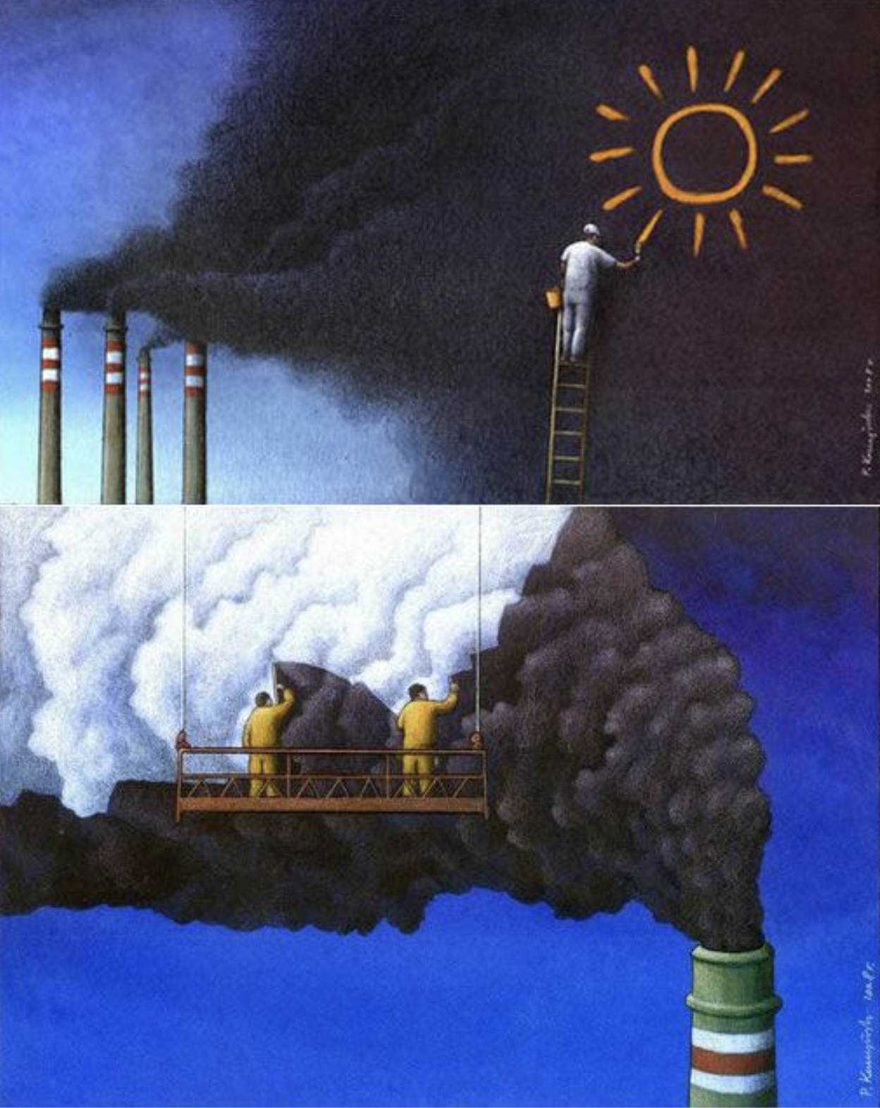 Explain how the use of satire in these images criticize society's response to environmental issues?