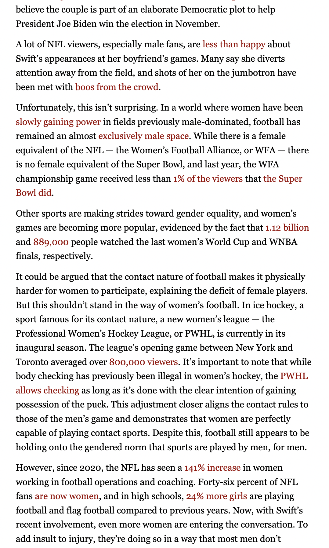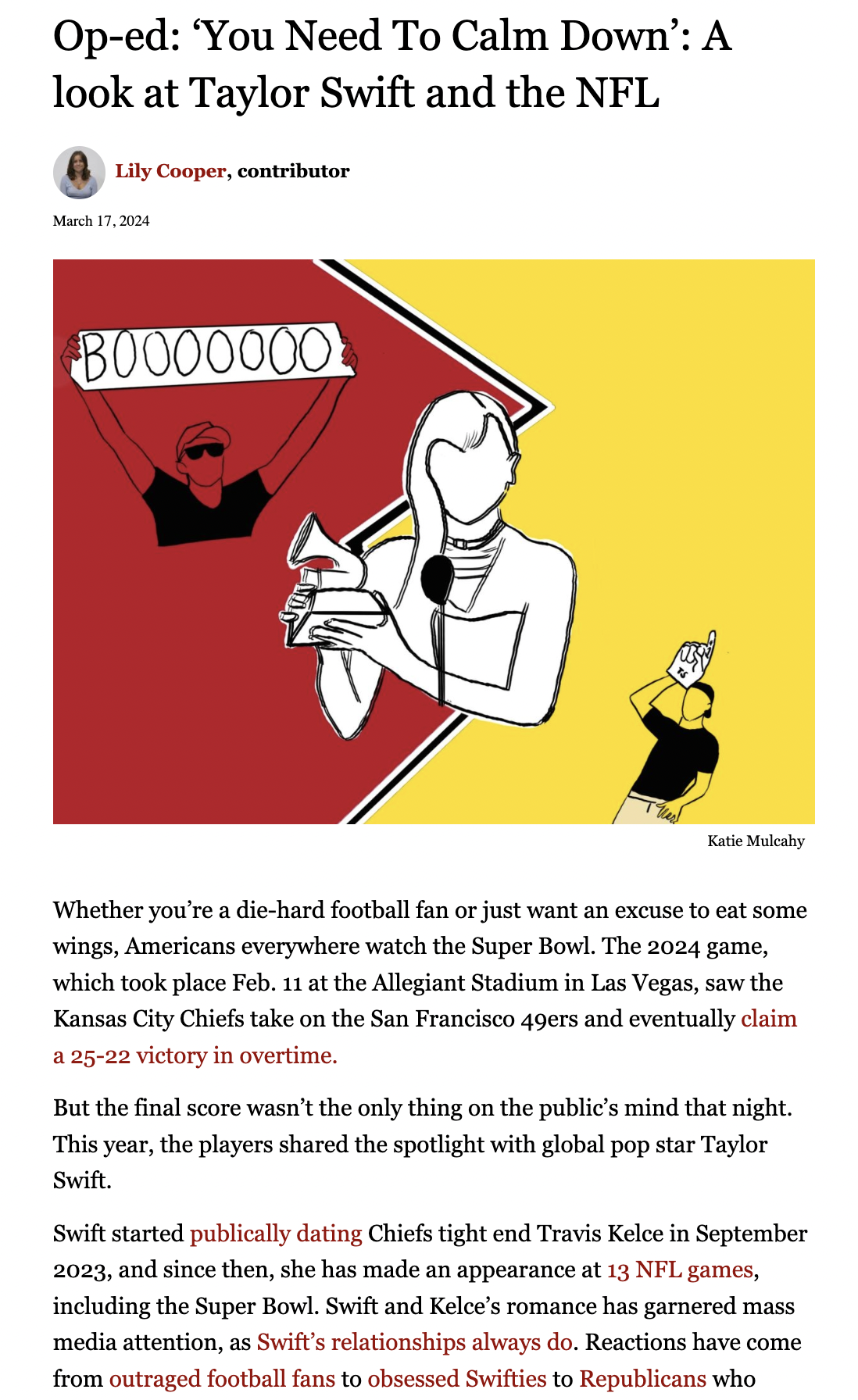 Using your responses to the questions above, create a bullet point outline to respond to the guiding question: How does the op-ed use rhetorical devices and language techniques to critique the reaction to Taylor Swift’s presence in the NFL?