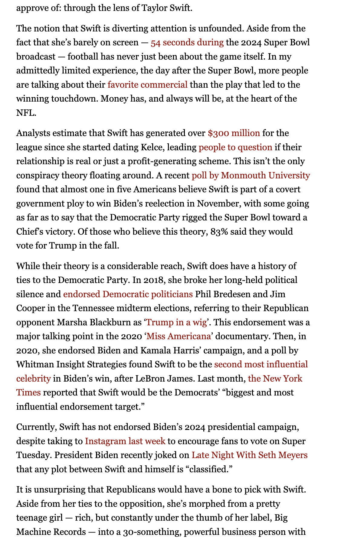 Examine how the text uses irony to critique the conspiracy theories surrounding Taylor Swift’s relationship with Travis Kelce.