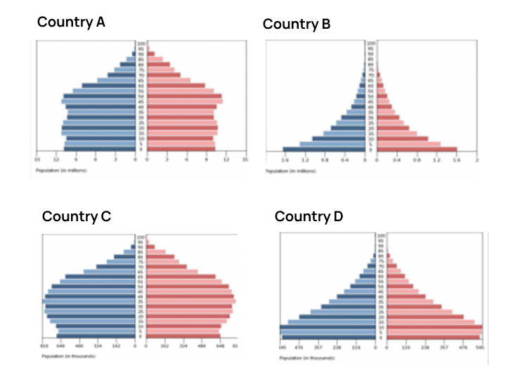 With reference to Figures 1, 2, 3, and 4, suggest three possible reasons for the changes between the age–gender pyramid for 1990 and that projected for 2060.