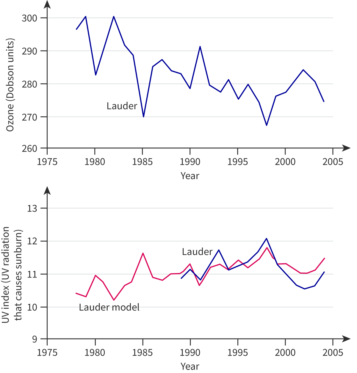 The figure shows the change in stratospheric ozone levels above Lauder, New Zealand, and associated UV radiation index