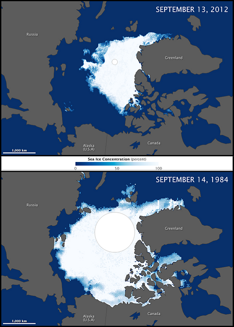 Two maps of Greenland comparing the percentage of sea ice concentration between September 14, 1984 and September 13, 2012.