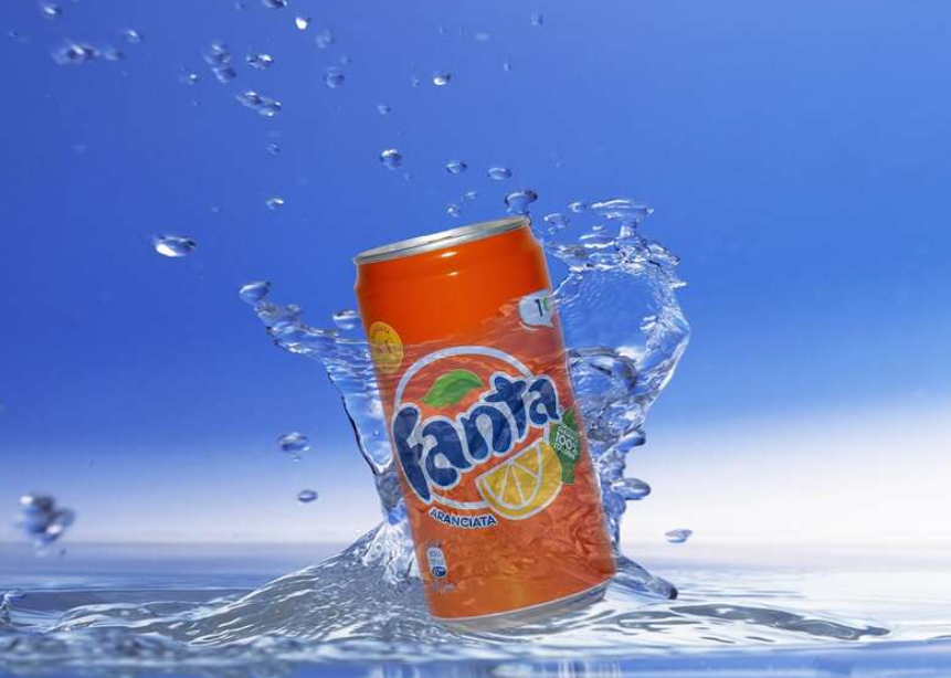 Quel est l’effet de l’arrière-plan bleu et du contraste avec l’orange de la canette sur la perception de la boisson ?