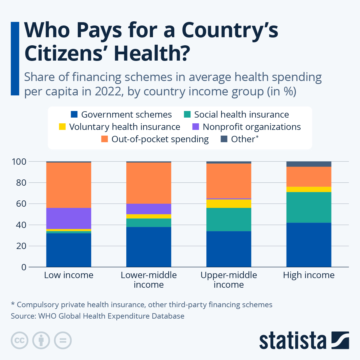 The graph shows the share of financing schemes in average health spending per capita in 2022, by country income group (in %).