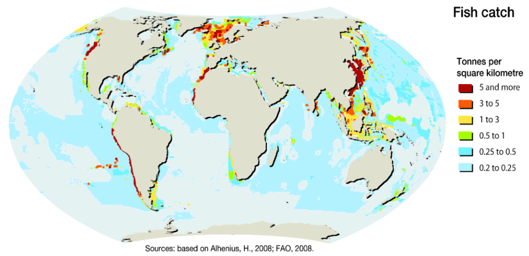 The map below shows the fish catch (tonnes per square kilometre) globally