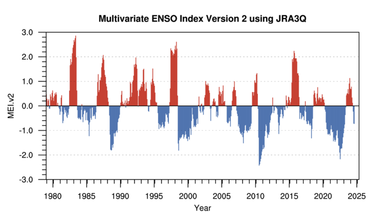 The graph shows the relative strength of El Niño and La Niña events from 1950 to 2024.