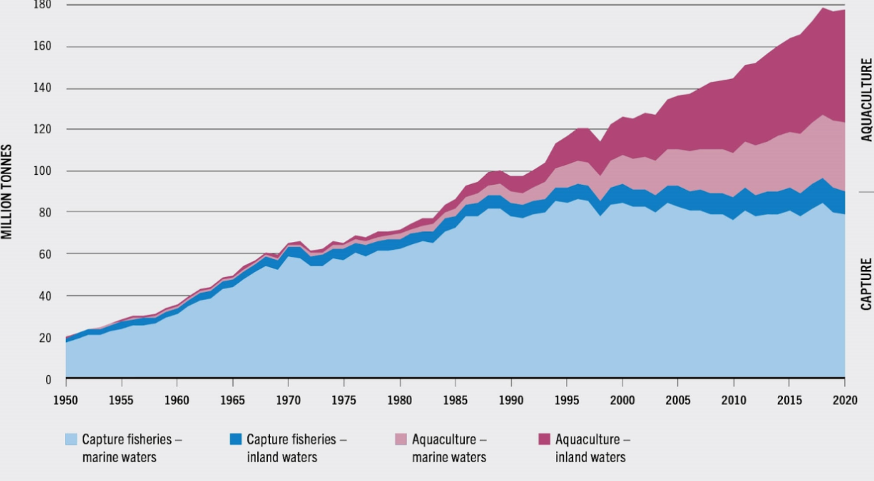 The graph below shows the Global Fisheries and Aquaculture in Million tonnes