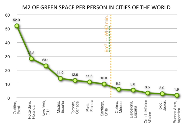 The graph shows the m² (meters squared) of green space per person in cities around the world.