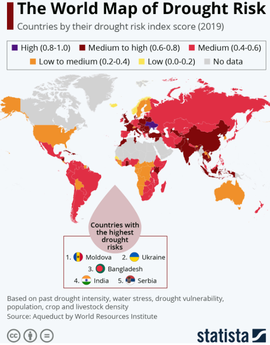 Describe the global distribution of countries with medium to high drought risk