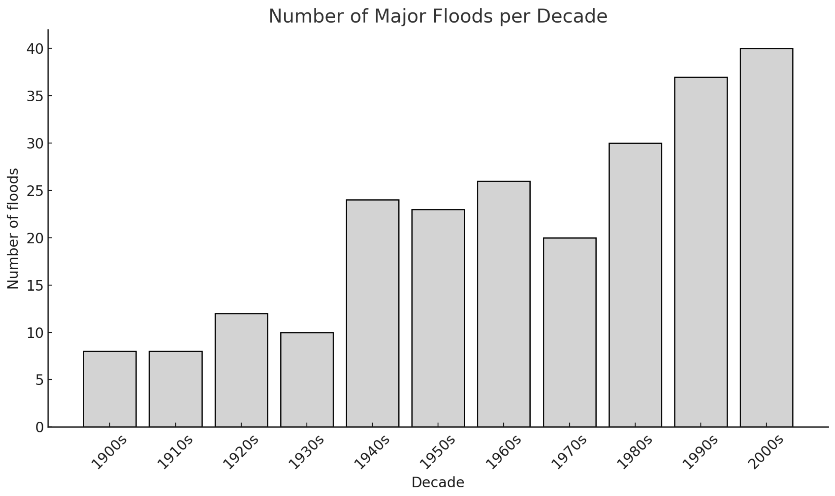 The following figure indicates the number of major floods per decade.