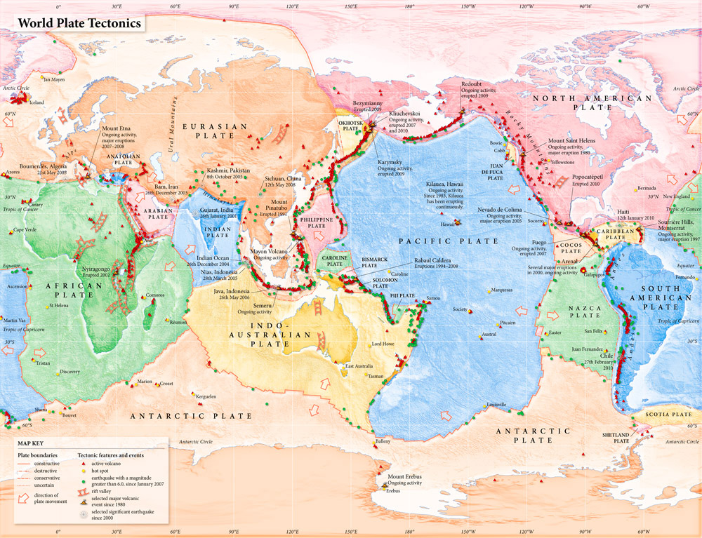 The map shows global tectonic plates, the locations of volcanoes and earthquakes, and selected tectonic events since 2000.