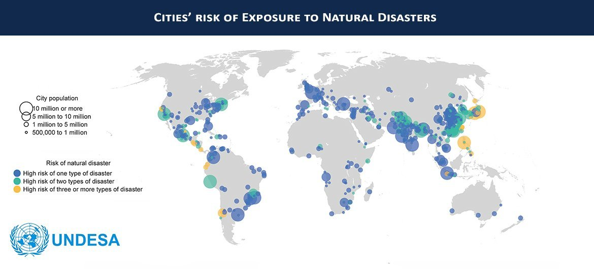 The map below shows Cities’ Risk of Exposure to Natural Disasters.