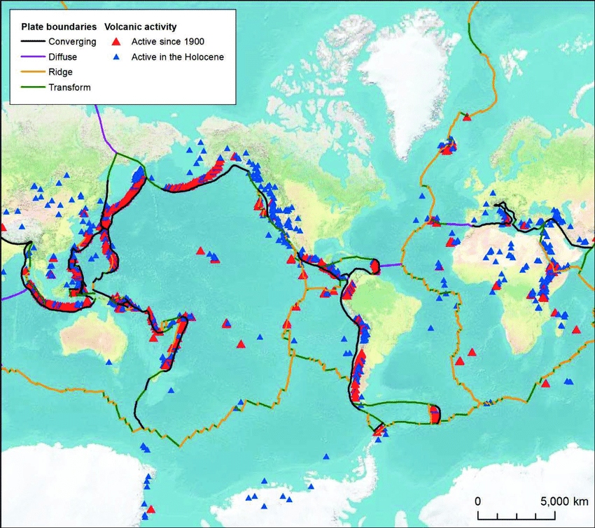 The map below shows The Global Distribution of Volcanoes and Plate Boundaries.
