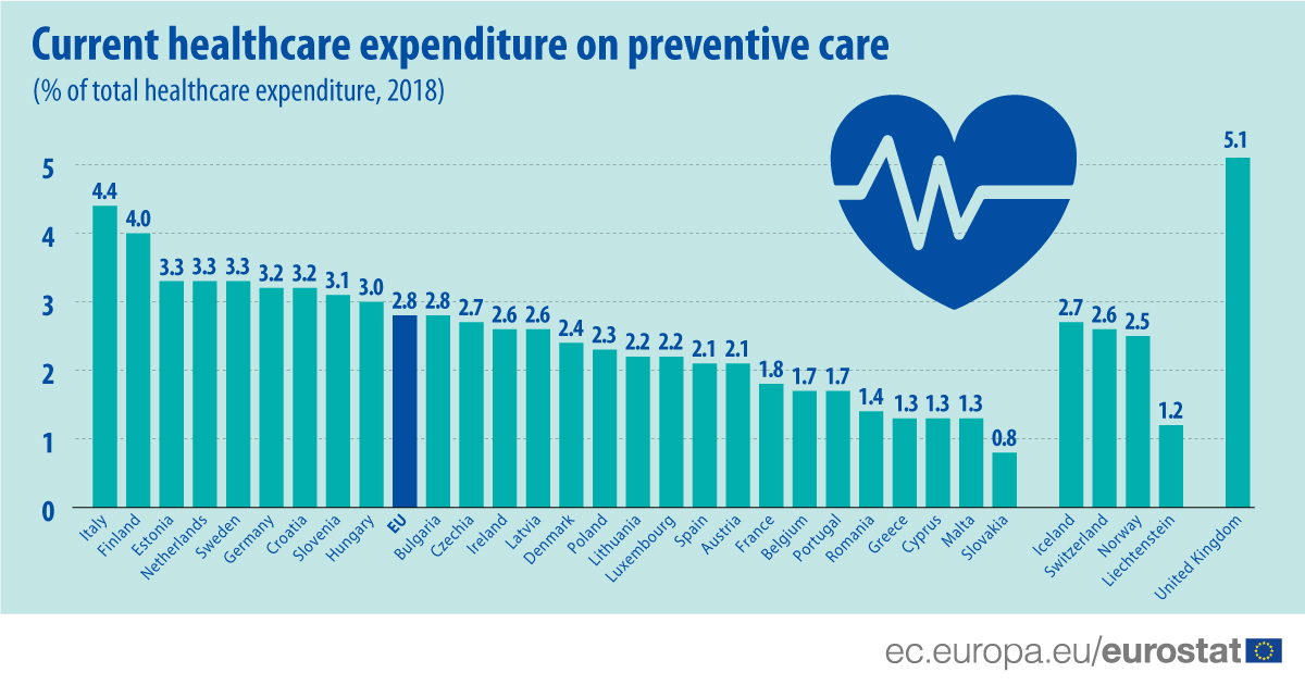 The graph shows the percentage of total healthcare expenditure spent on preventive care in selected European countries in 2018.
