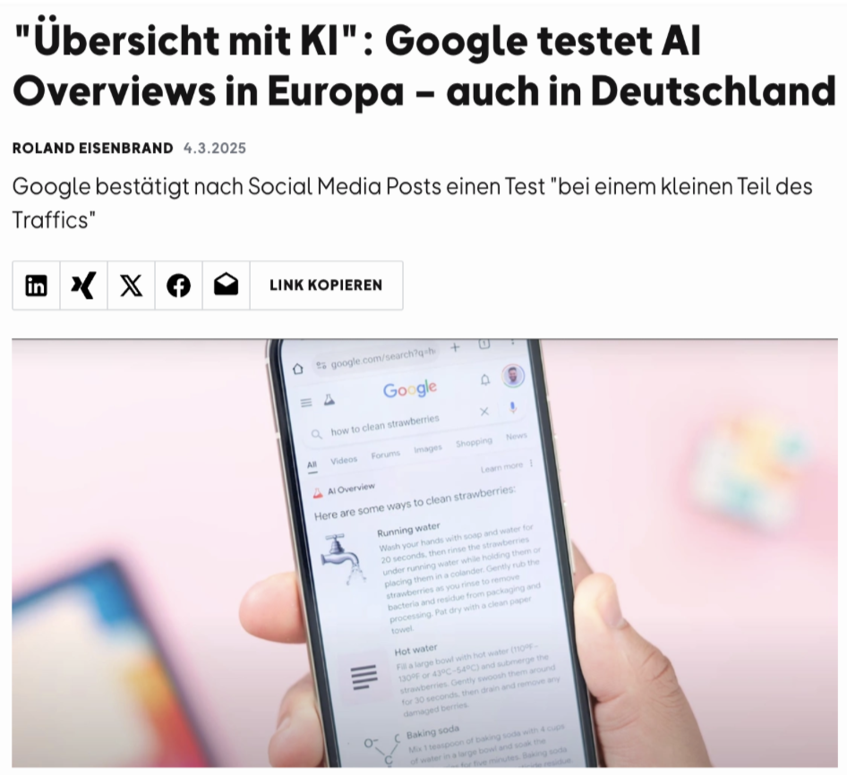 Wie viel weniger Klicks leitet Google nun weiter? Dazu, in welchem Maß die Klickraten durch AI Overviews einbrechen, gibt es unterschiedliche Studien. Die US-Agentur Seer Interactive hat die Klickraten, "normaler" organischer Google-Ergebnisse mit den von AI Overviews verglichen und dramatische Unterschiede gesehen. Wenig überraschend ist der Vergleichspunkt essenziell. Die Betreiberinnen des deutschen SEO-Tools Sistrix hatten im vergangenen November die Klickraten von AI Overviews mit denen vom "Vorgänger-Format" "Featured Snippets" verglichen und festgestellt, dass AI Overviews auf den ersten drei Plätzen sogar mehr Klicks als "Featured Snippets" verzeichneten. Search-Marketing-Experte Kevin Indig hat zuletzt 19 solcher Studien zusammengefasst. Seine Erkenntnis: AI Overviews werden eher bei informationen statt transaktionalen (bei denen es um einen Kauf geht) Suchen ausgespielt; und zwar am häufigsten bei Gesundheitsthemen. Wie sollten sich nun deutsche und europäische Publisher und Online-Marketing-Macherinnen auf den offiziellen Start von Googles KI-Antworten vorbereiten? Sistrix-Gründer Johannes Beus glaubt zum einen, dass einzigartiges Expertenwissen noch wichtiger wird, und dazu "eigene authentische Fotos, Videos, Meinungen, Einschätzungen und Erfahrungen". Zum anderen empfiehlt er: "Werde eine Marke". Denn Google werde in den Suchergebnissen künftig immer weniger URLs anzeigen oder verlinken, sondern Marken, Personen und allgemein "bekannte Entitäten" nennen.