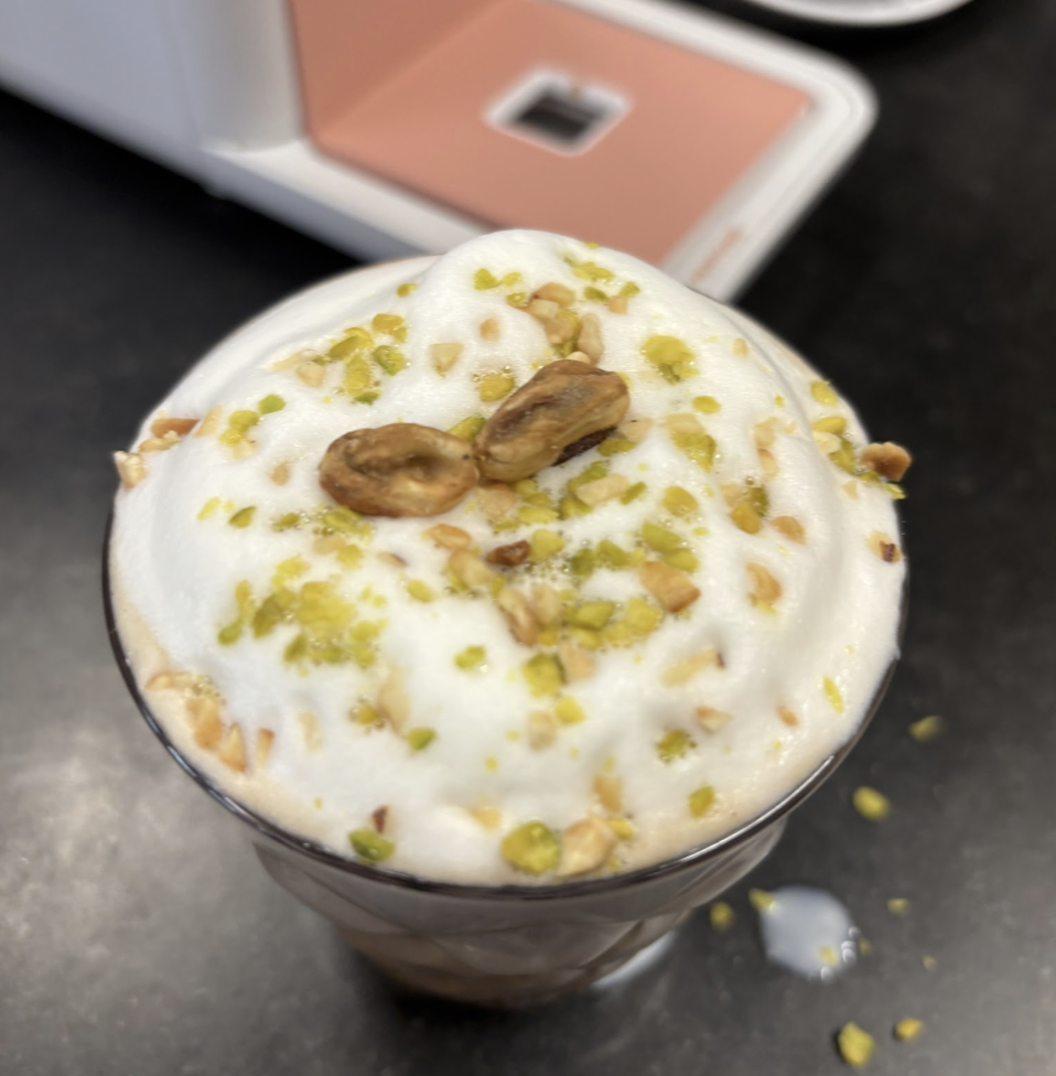 Zum Glück hat Indre vorgesorgt und alle benötigten Zutaten für den Dubai Style Coffee am Start. Größte Änderung zur Inspirationsquelle ist der Austausch von Engelshaar mit Krokant als Topping. Sonst kommen in den Drink dunkle Schokosoße, Pistaziencreme und natürlich ein Kaffee. Indres Empfehlung: Ein nussiger, starker Espresso.