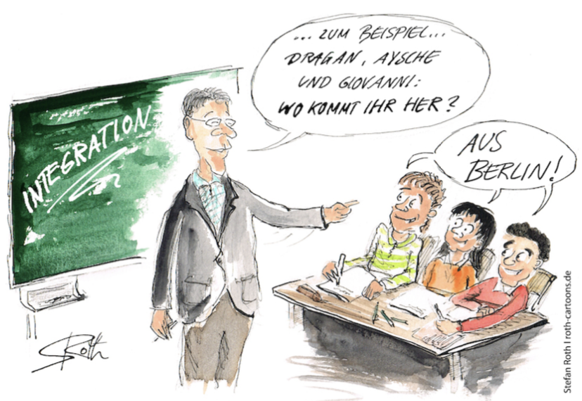 Welche Kritik an gesellschaftlichen Wahrnehmungen von Integration und „Herkunft“ könnte die Karikatur ausdrücken?