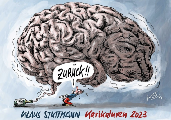 Warum liegt eine leere Flasche mit der Aufschrift „KI“ (Künstliche Intelligenz) auf dem Boden, und welche Verbindung könnte sie zur Botschaft der Karikatur haben?